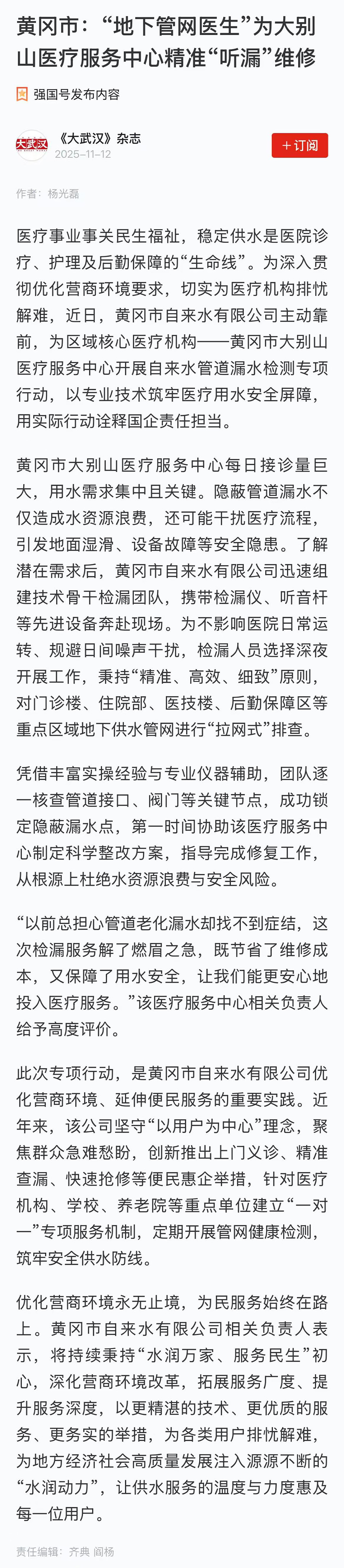 醫(yī)療事業(yè)事關(guān)民生福祉,穩(wěn)定供水是醫(yī)院診療、護(hù)理及后勤保障的“生命線”。為深入貫徹優(yōu)化營商環(huán)境要求,切實為醫(yī)療機構(gòu)排憂解難,近日,黃岡市自來水有限公司主動靠前,為區(qū)域核心醫(yī)療機構(gòu)——黃岡市大別山醫(yī)療服務(wù)中心開展自來水管道漏水檢測專項行動,以專業(yè)技術(shù)筑牢醫(yī)療用水安全屏障,用實際行動詮釋國企責(zé)任擔(dān)當(dāng)。