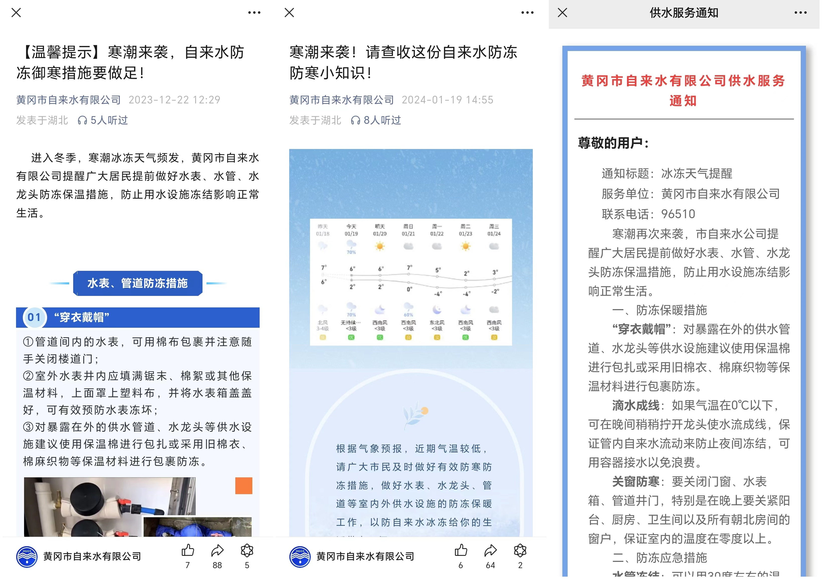 為廣泛宣傳防寒防凍知識,自2月1日起公司通過微信公眾號每日推送防寒防凍消息,大力宣傳防凍保溫措施以及防凍應(yīng)急措施,號召廣大居民對水表、管道、閘閥、水龍頭等用水設(shè)施進(jìn)行“穿衣戴帽”,避免冰凍寒冷天氣造成水管、水表凍結(jié)、凍裂,影響正常用水。