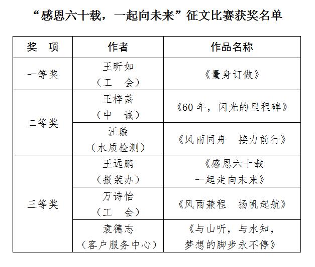 此次征文活動(dòng)以“感恩六十載,一起向未來(lái)”為主題,歷時(shí)1個(gè)月時(shí)間,共收到各類(lèi)作品23篇,經(jīng)公司評(píng)委會(huì)初評(píng)、復(fù)評(píng)等環(huán)節(jié),最終評(píng)選出優(yōu)秀作品。