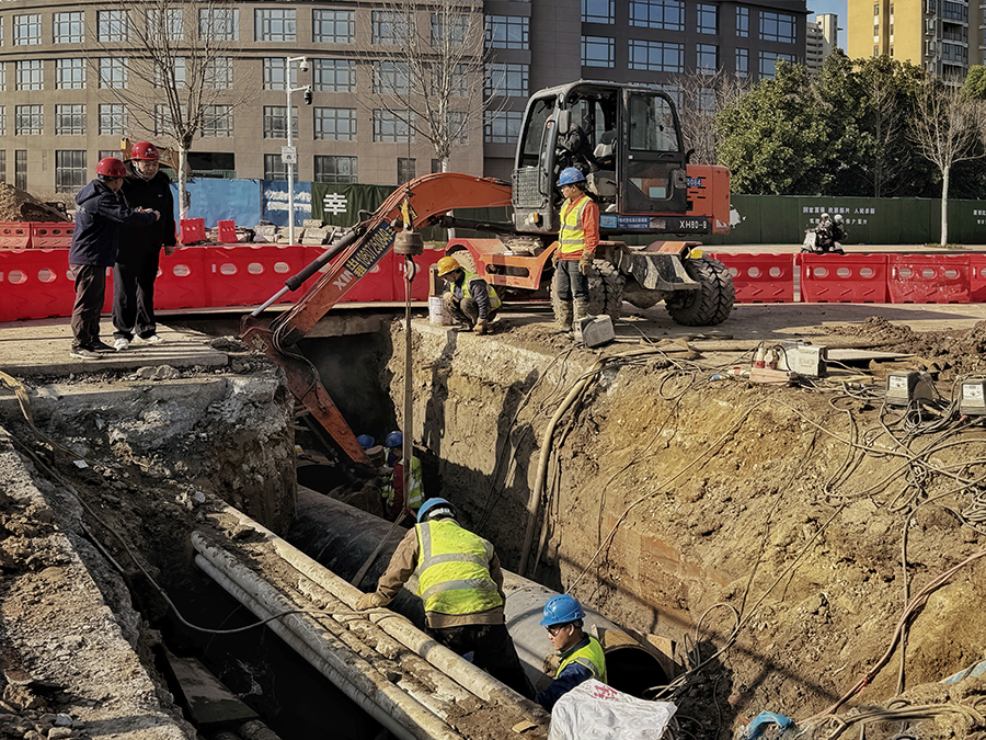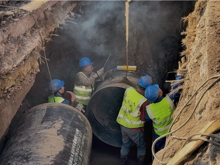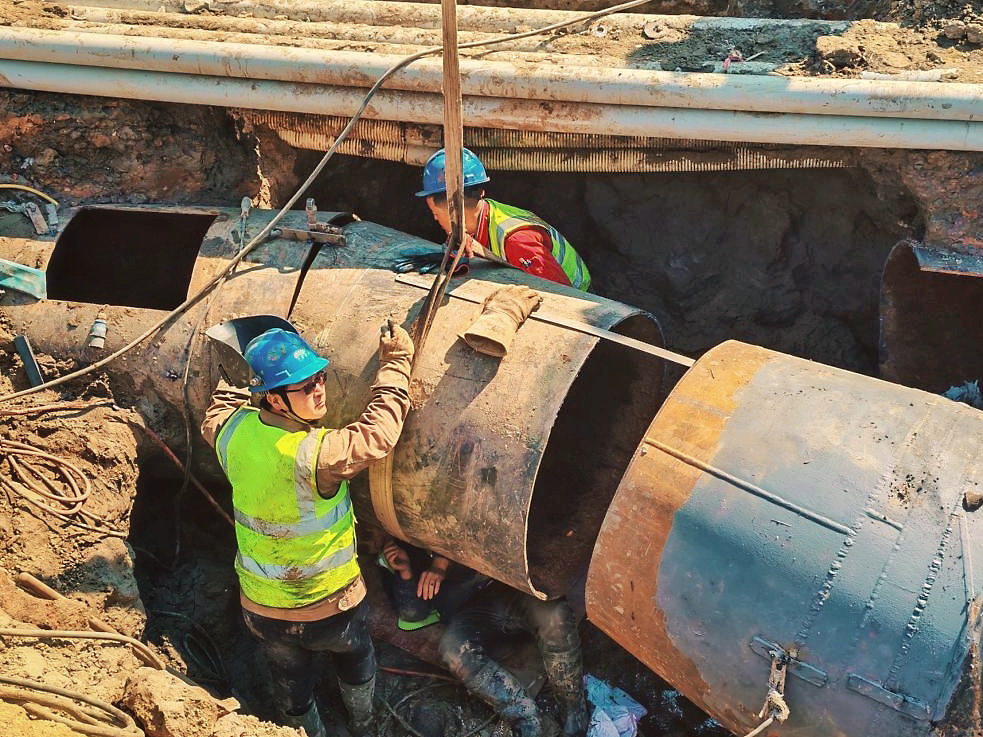 作為釋放三水廠產(chǎn)能、優(yōu)化城區(qū)供水格局的核心項目,該工程從設計之初便面臨多重挑戰(zhàn)。新建的DN1200管道需橫穿寶塔大道、黃州大道兩大交通主干道和青磚湖路次干道,且與正在運行的DN1000管道施工間距較小,既要確保在用管網(wǎng)正常供水,又需克服地下強弱電、天然氣、通訊地和國防光纜以及雨污等多家單位地下管線交錯的復雜環(huán)境。面對冬季施工條件嚴苛、交通疏導壓力巨大等難題,公司生產(chǎn)管理中心聯(lián)合黃岡市城管執(zhí)法委、黃岡市交警支隊等部門建立聯(lián)席會議機制,并邀請相關地下管線單位召開9次現(xiàn)場協(xié)調(diào)會,攻克地下管線交叉、占道施工影響交通安全等11項關鍵問題;黃岡市網(wǎng)拓水務工程有限責任公司采用“夜間錯峰施工+分段圍擋作業(yè)”模式,通過晝夜兩班倒、多作業(yè)面穿插推進,最大限度降低對市民出行的影響。