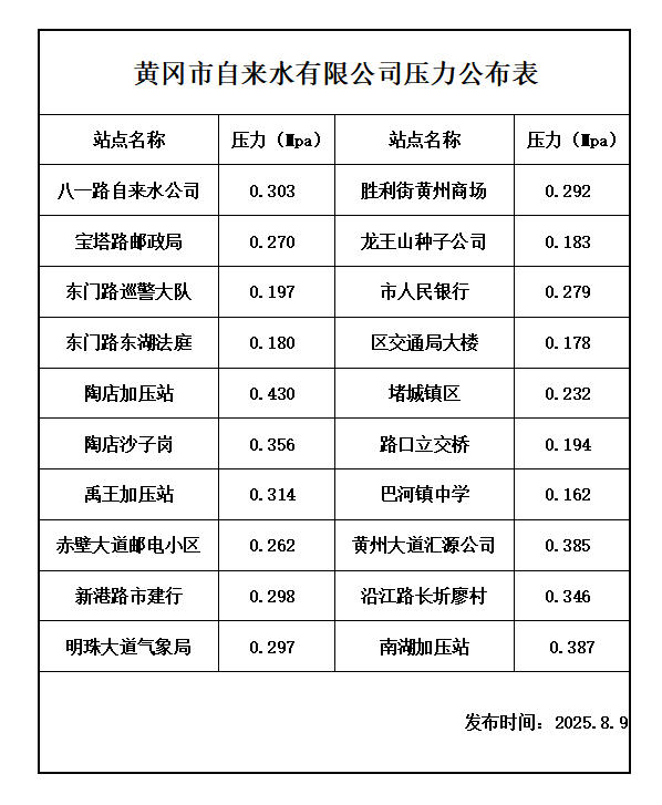 2025年8月9日水壓報告表